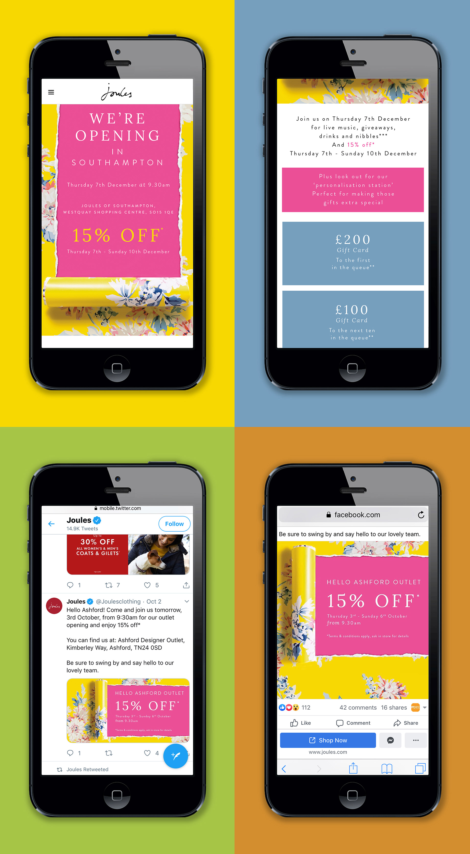 Artwork and retouch a range of marketing material to raise awareness of a new Joules store opening, whilst working to an approved concept. Required digital items included Desktop and Mobile Emails along with Twitter and Facebook social assets. Printed material included double sided flyers along with shop front advertising.